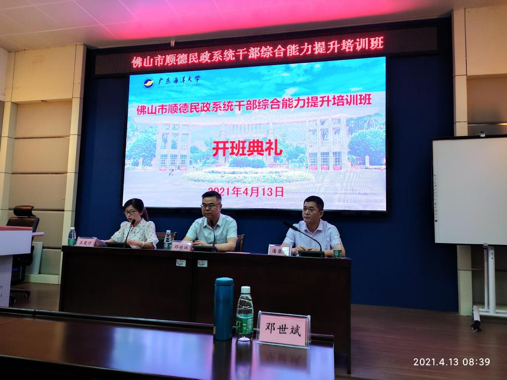 4月13日上午,佛山市顺德民政系统干部综合能力提升培训班在我校湖光校区博物馆会议室顺利开班。佛山市顺德民政系统邓世斌科长、继续教育学院潘康培副院长以及培训班40名学员和相关人员参加开班典礼。开班典礼由继续教育学院王爱珍主持。