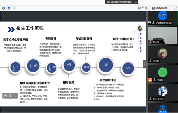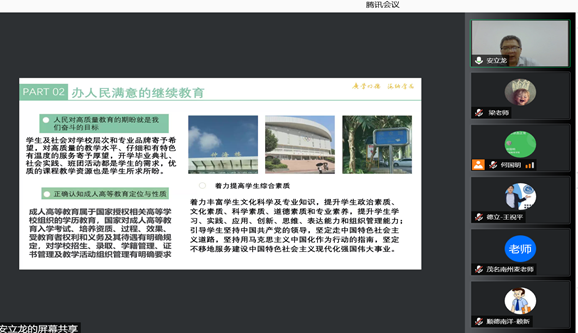 招生办主任李明焜就2021年招生工作做了具体的安排,重点梳理了招生的工作流程、指出招生工作中存在的问题、提醒需注意的事项,并对招生工作最新文件的改革措施做了详细解读;同时结合我校和教学点的实际情况,提出解决方案。教务办主任刘靖就新学期教学工作安排做了具体的部署。
