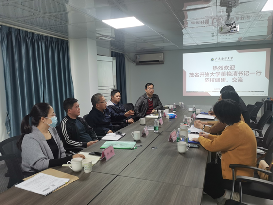 12月1日下午,茂名开放大学书记、校长董艳清一行5人莅临继续教育学院,就乡村振兴培训与人才培养、高等学历继续教育合作等议题进行工作交流,对下一步合作达成共识。继续教育学院院长安立龙,副院长何国明、潘康培,以及相关科室工作人员参加了交流会。