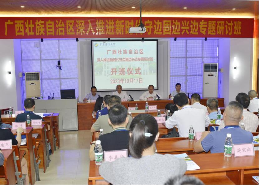 10月17日上午,广西壮族自治区深入推进新时代守边固边兴边专题研讨班在我校霞山校区顺利开班。广西壮族自治区国防动员办公室副主任赵越,BETVLCTOR伟德在线党委常委、副校长邓逢光,广西壮族自治区国防动员办公室海洋权益处处长张绍华、BETVLCTOR伟德在线继续教育学院副院长潘康培和培训班学员及相关工作人员参加开班仪式。