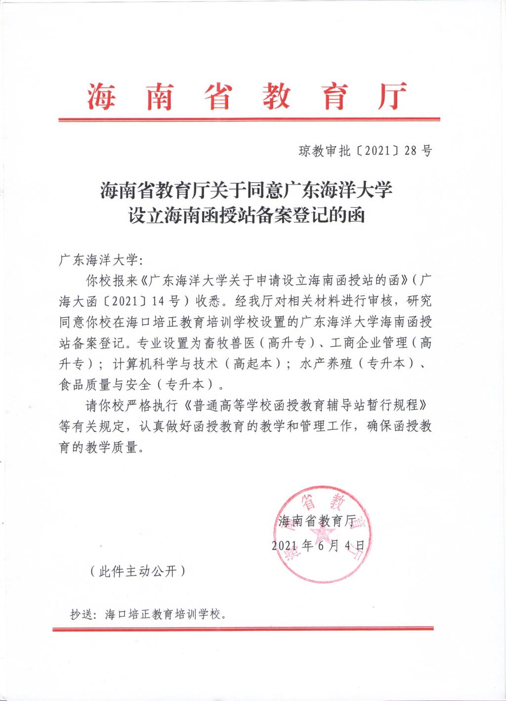 根据《BETVLCTOR伟德在线成人高等教育校外教学点管理办法》(校成教〔2019〕23号)的要求,结合我校未设有广东省外函授站的情况,我校向海南省教育厅提交设立海南函授站的申请,经海南省教育厅批复,同意我校在海口培正教育培训学校设置成人高等教育海南函授站,现把相关情况公告如下: