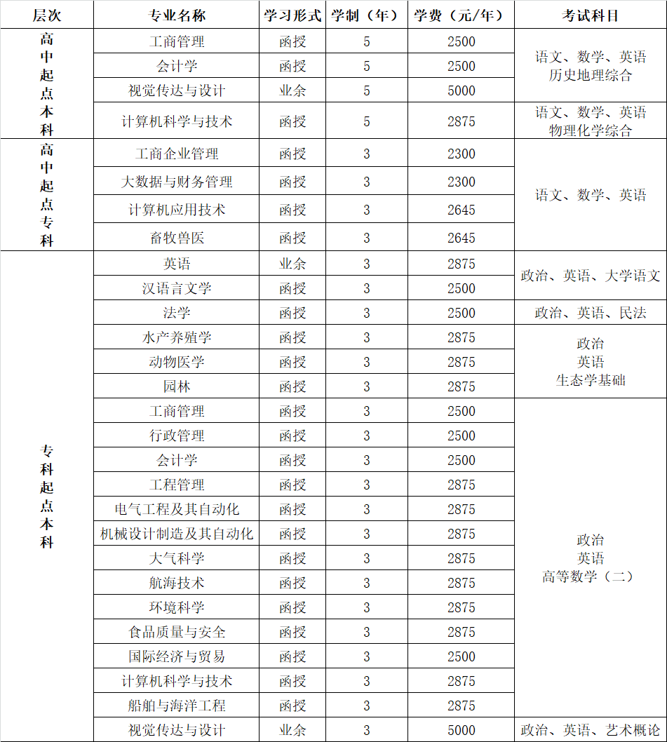 3.高起专(学制三年):文史、财经、管理类2300元/年;理工、农林、外语类2645元/年。
