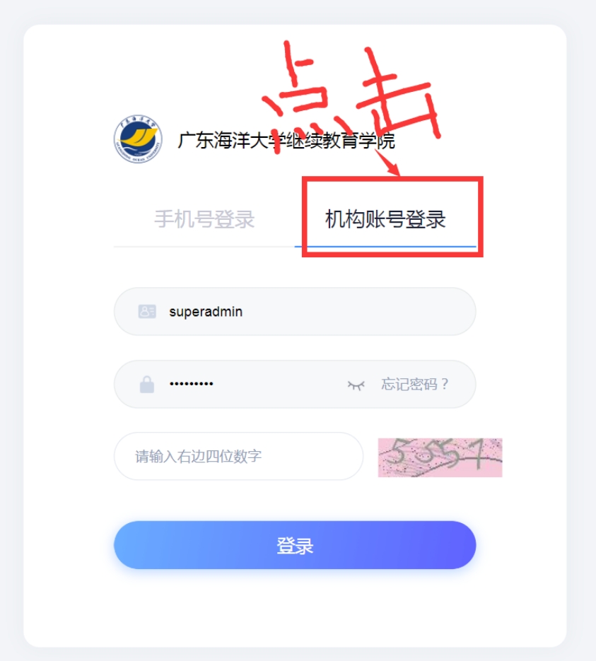 4.新生必须在班主任或教务员的指导下,登录综合教务管理系统(http://gdhydx.jxjy.chaoxing.com/login),首次登录需选择机构账号登录页面进行登录,账号为学号,密码为身份证号后六位,学号由学校继续教育综合教务管理系统(统一)生成,由班主任或教务员下发。学生首次登录综合教务管理系统,需完善并核对个人信息,如有错误,应立即报给班主任或教务员上报学院进行修改。新生可使用综合教务管理系统查看个人学籍资料、课程安排、提交各类申请以及查阅学校、学院通知公告等。
